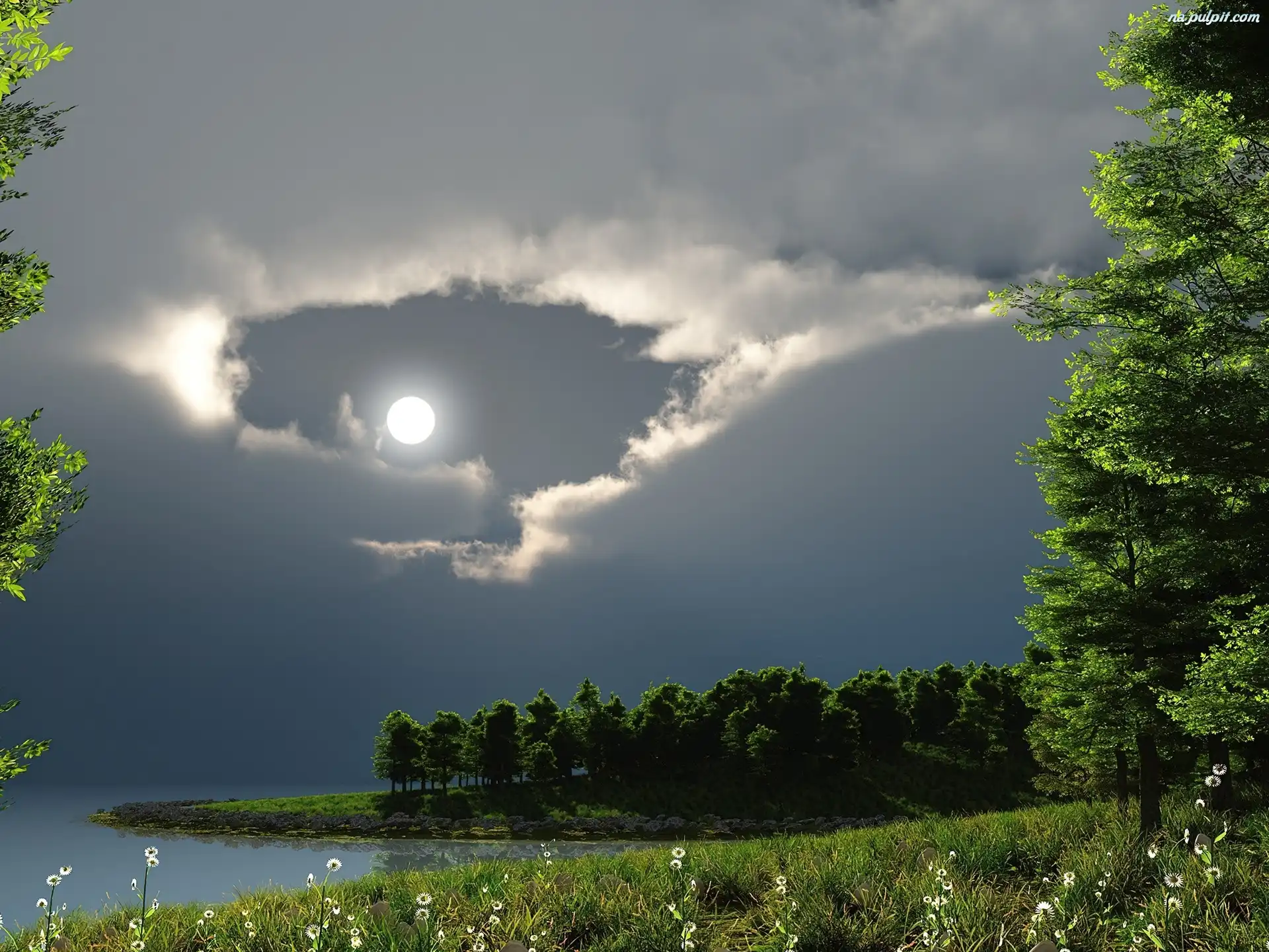 Grafika, Księżyc, Chmury, Zieleń