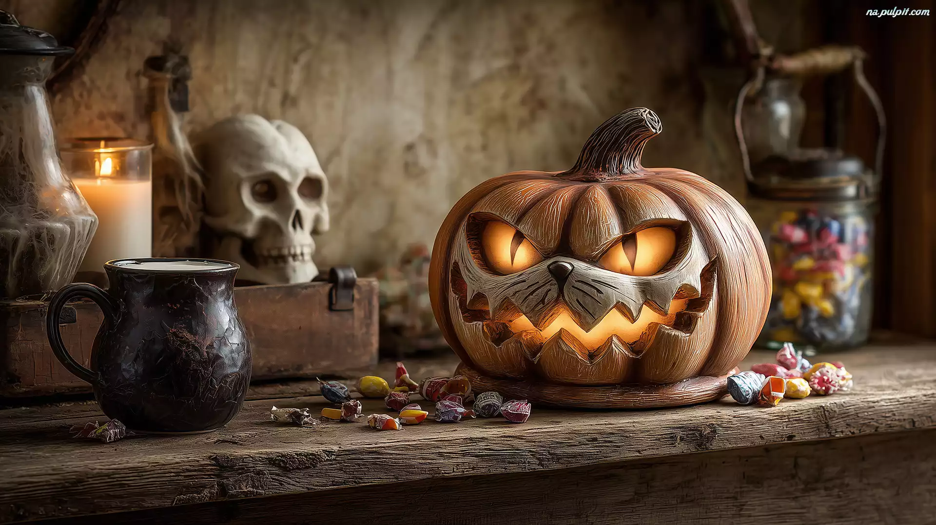 Halloween, Dynia, Kubek, Grafika AI, Cukierki Na Pulpit