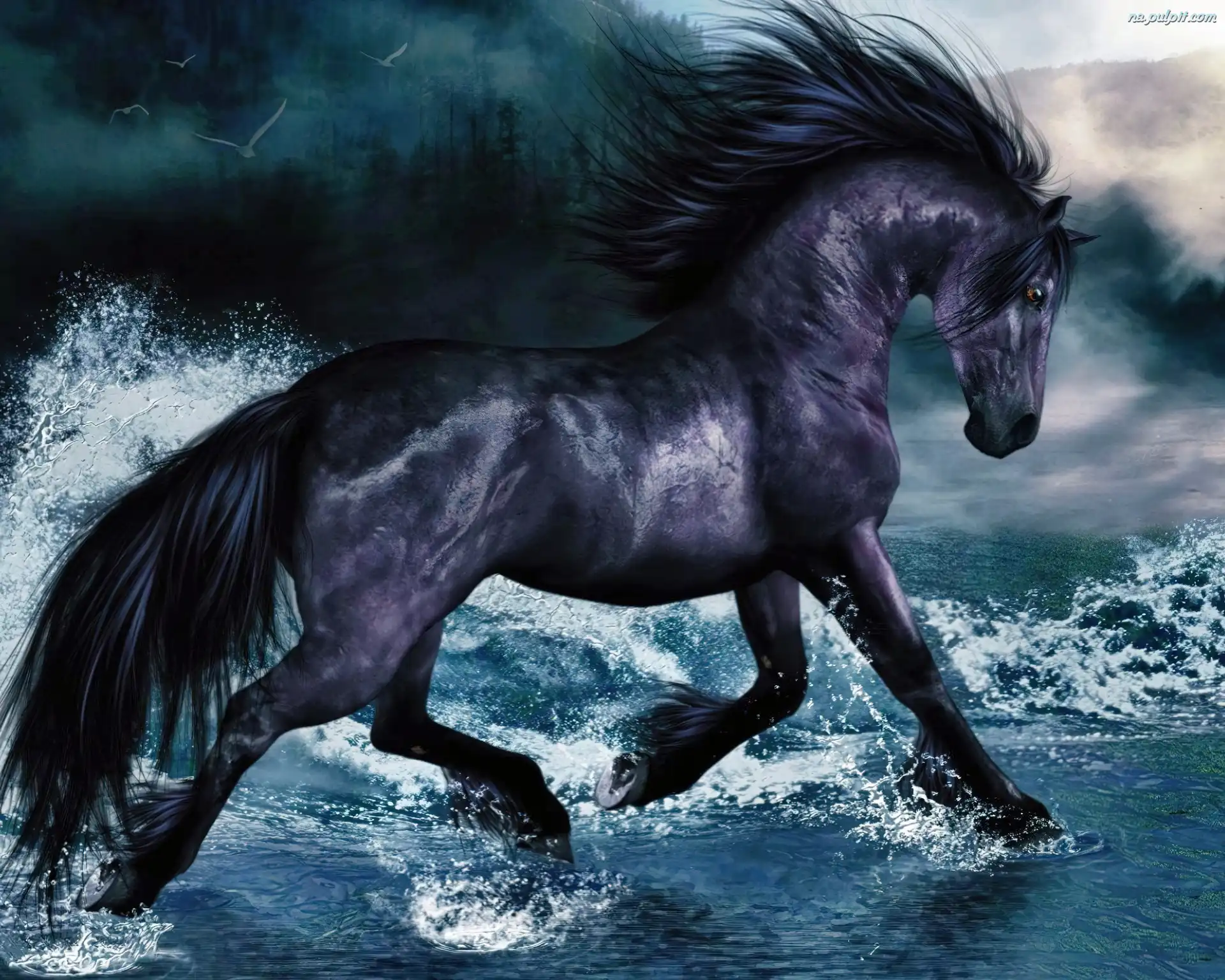 Grafika, Koń, Czarny, Morze Na Pulpit