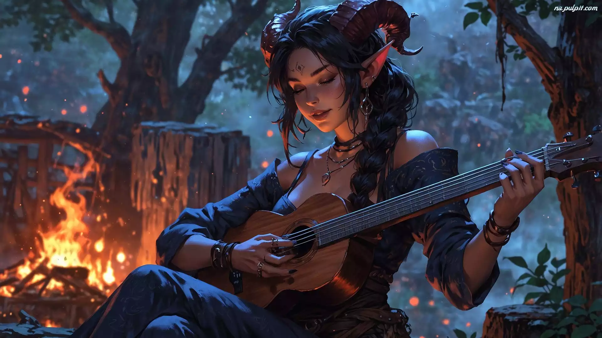 Gitara, Grafika, Elfica, Ognisko, Dziewczyna Na Pulpit
