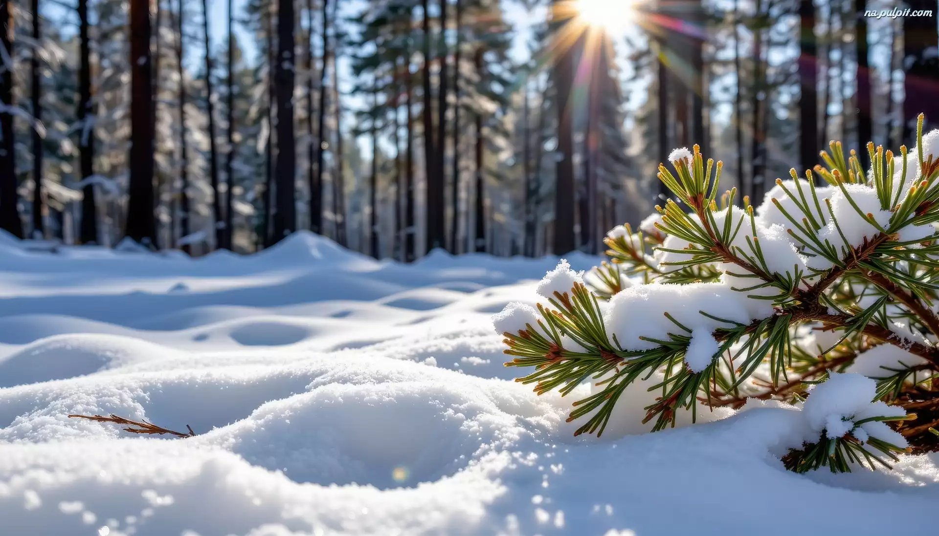 Grafika AI, Promienie słońca, Drzewa, Śnieg, Gałązka, Las, Zima Na Pulpit