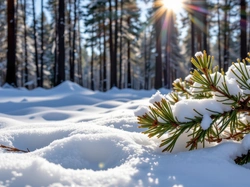 Grafika AI, Promienie słońca, Drzewa, Śnieg, Gałązka, Las, Zima