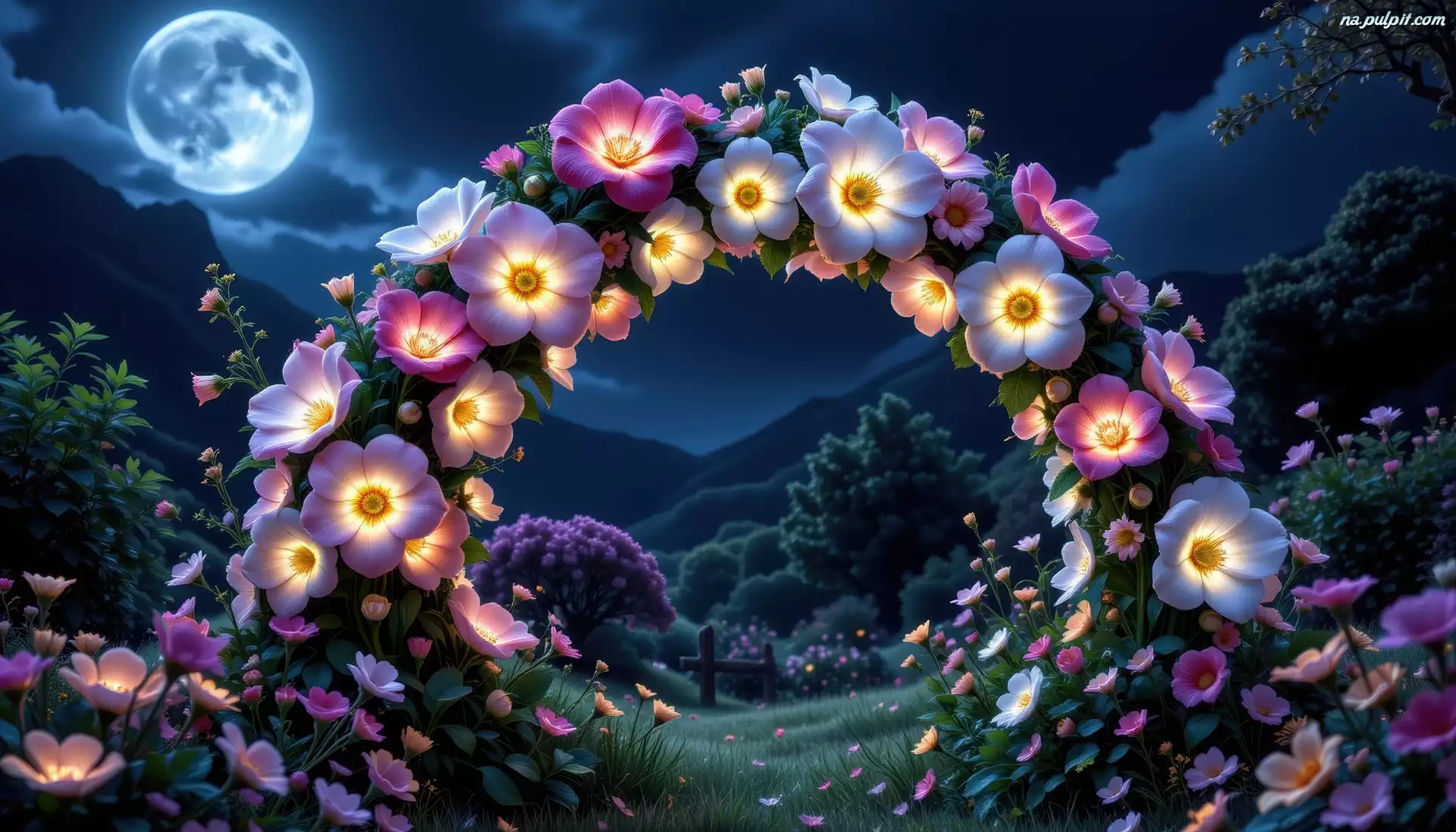 Noc, Kwiaty, Łuk, Grafika AI, Góry Na Pulpit