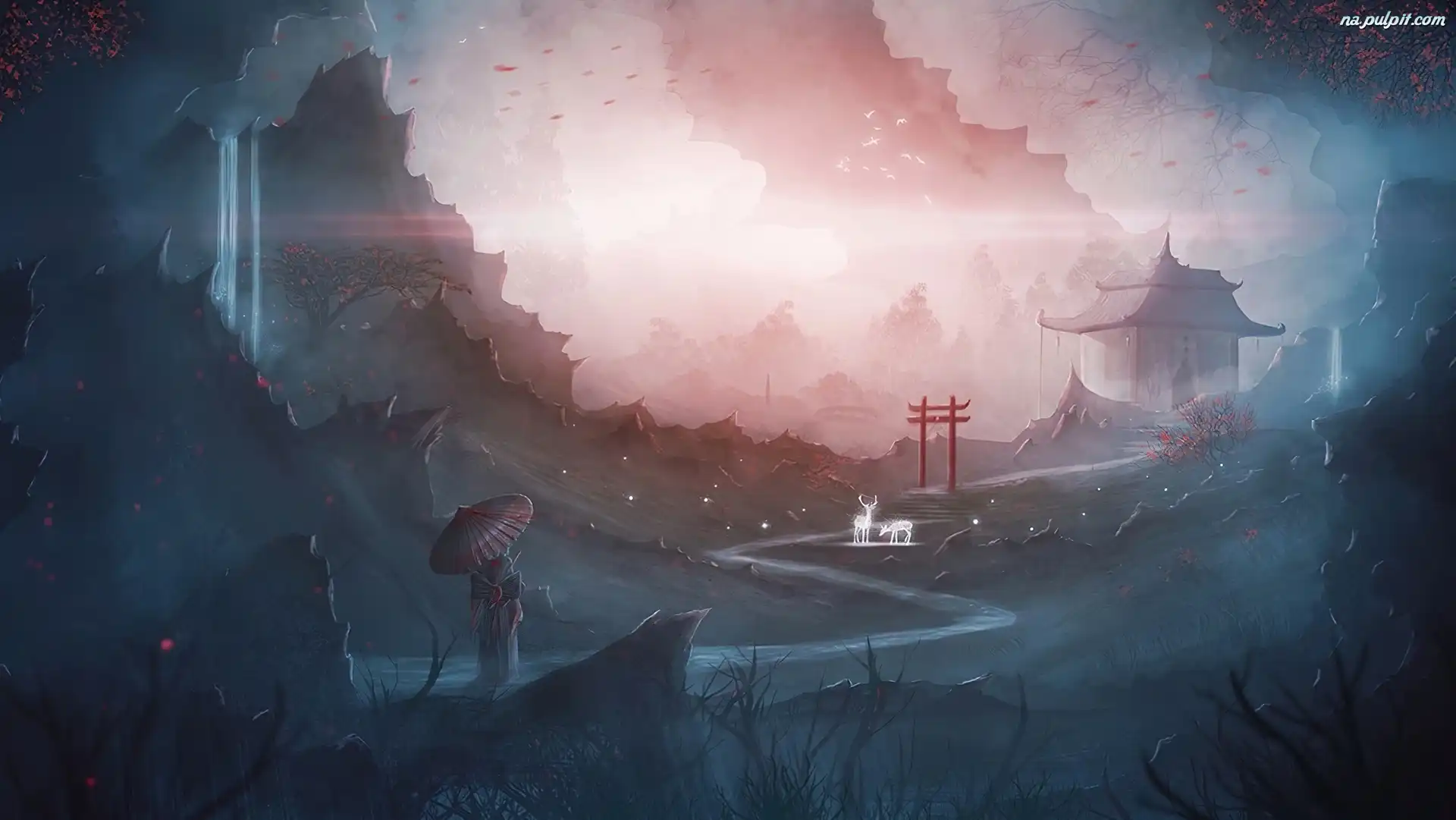 Grafika, Kobieta, Parasol, Góry, Japonia, Budynek Na Pulpit