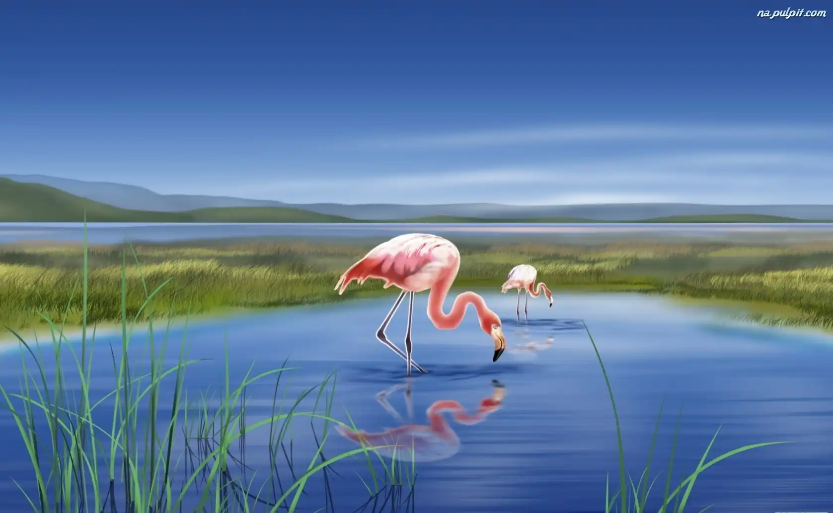 Grafika 2D, Dwa, Jezioro, Flamingi