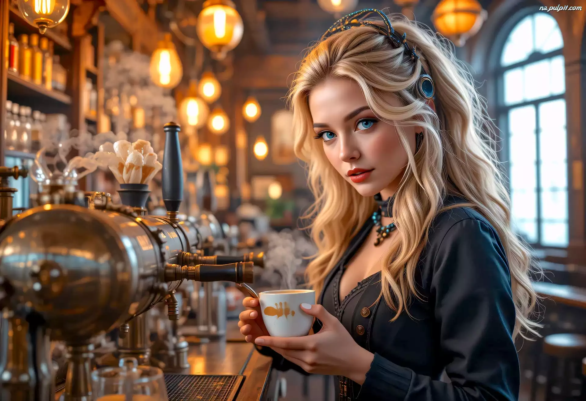 Kawiarnia, Kobieta, Blondynka, Grafika AI, Kawa Na Pulpit
