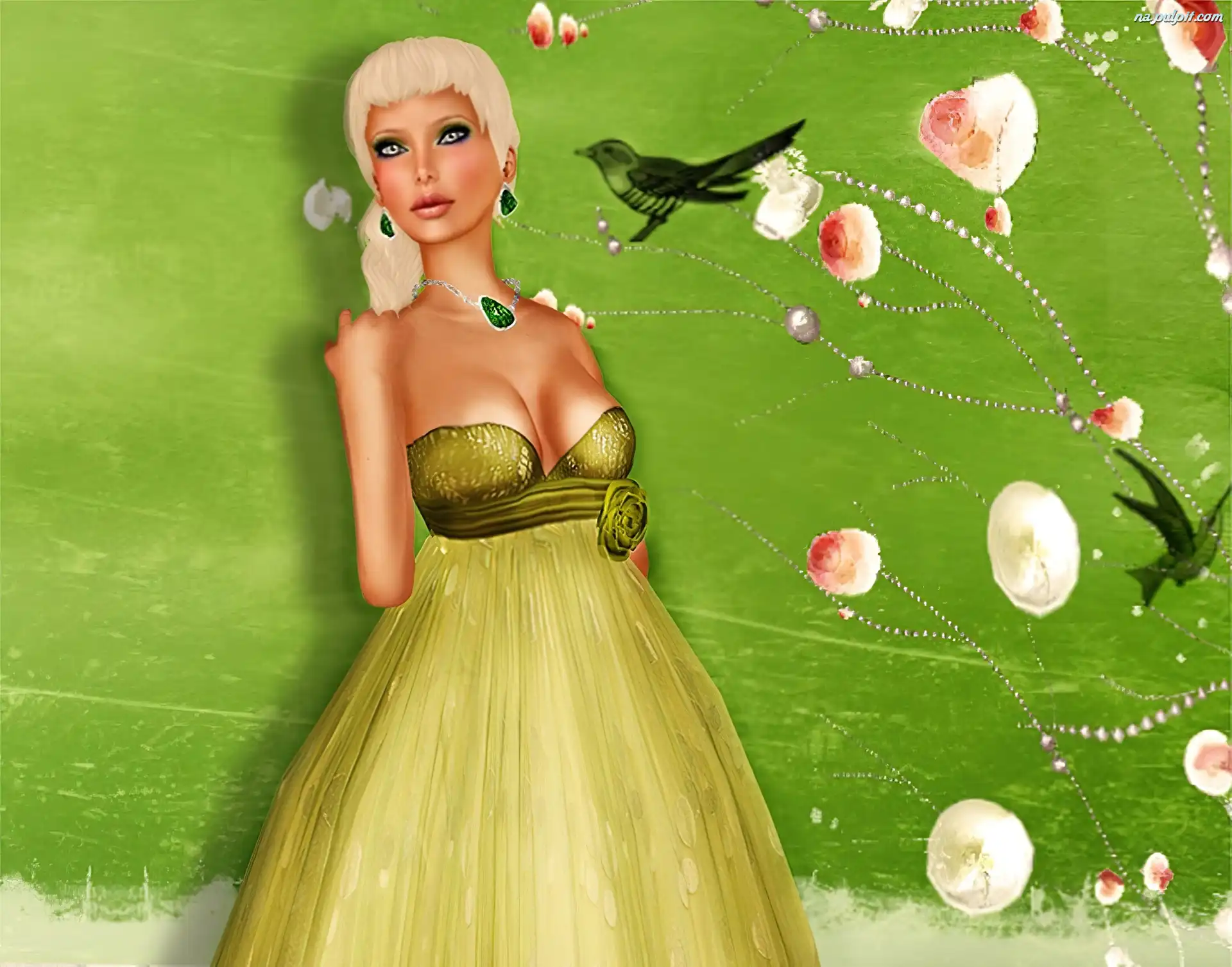 Grafika, Blondynka, Kobieta, Ptaki