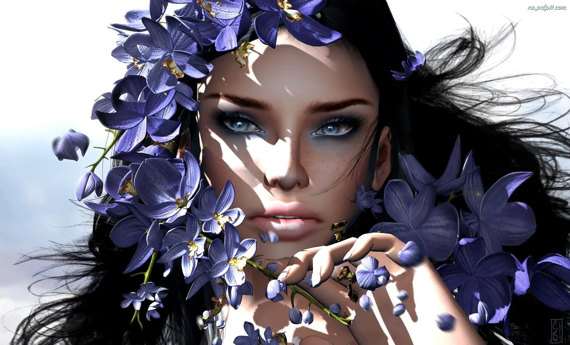 Grafika, Niebieskie kwiaty, Kobieta, Portret Na Pulpit