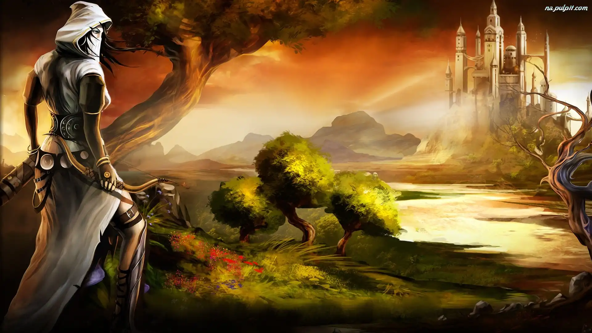 Grafika, Drzewa, Łuk, Kobieta, Zamek Na Pulpit