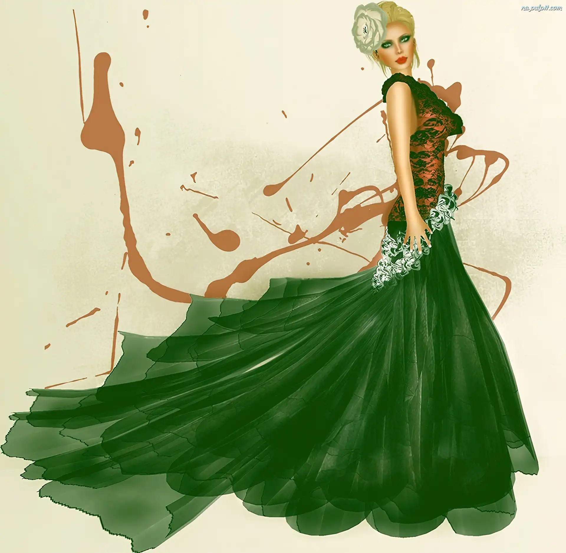 Grafika, Zielona, Kobieta, Suknia