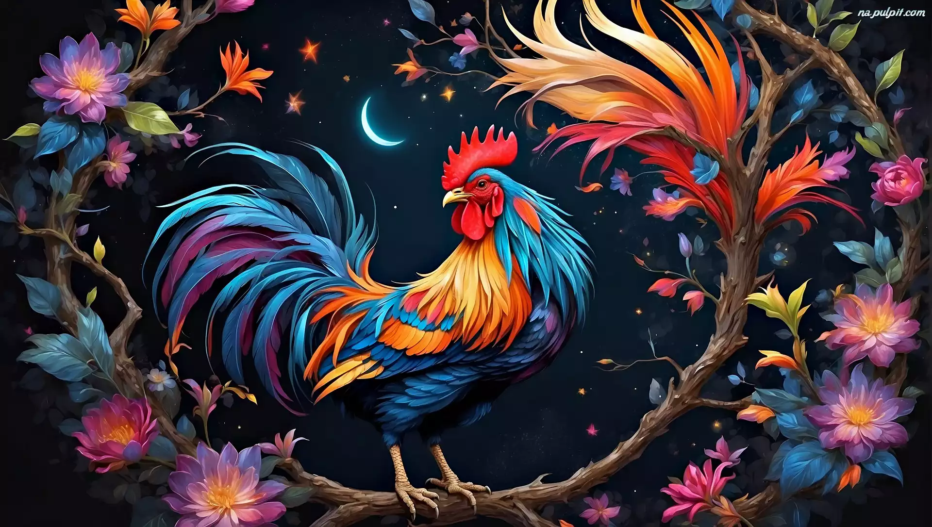 Kogut, Kolorowy, Kwiaty, Grafika Na Pulpit