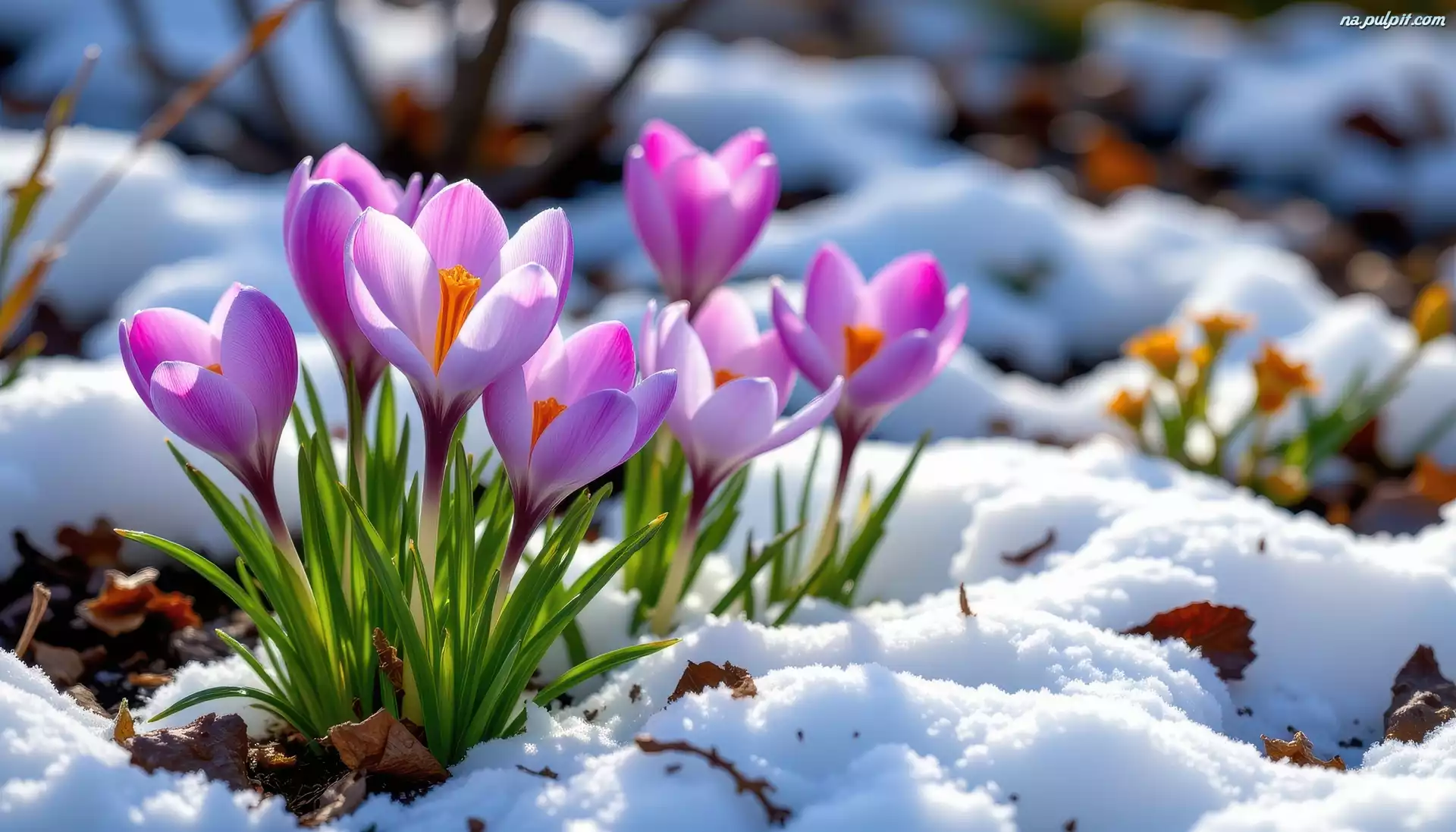 Åšnieg, Kwiaty, Fioletowe, Grafika AI, Krokusy Na Pulpit
