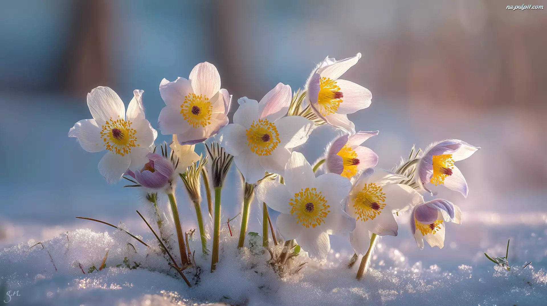 Śnieg, Sasanki, Białe, Grafika AI, Kwiaty Na Pulpit