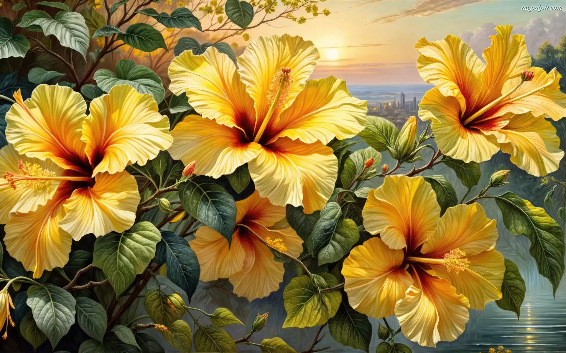 Kwiaty, Hibiskusy, Liście, Grafika Na Pulpit