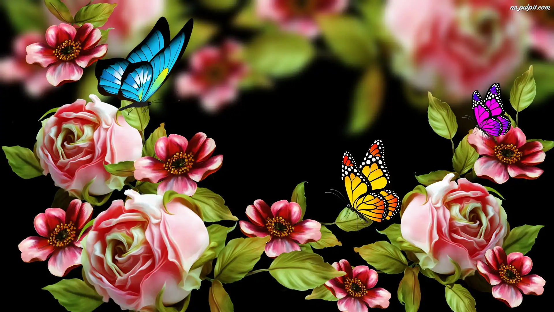 Kwiaty, Róże, Motyle, Grafika Na Pulpit