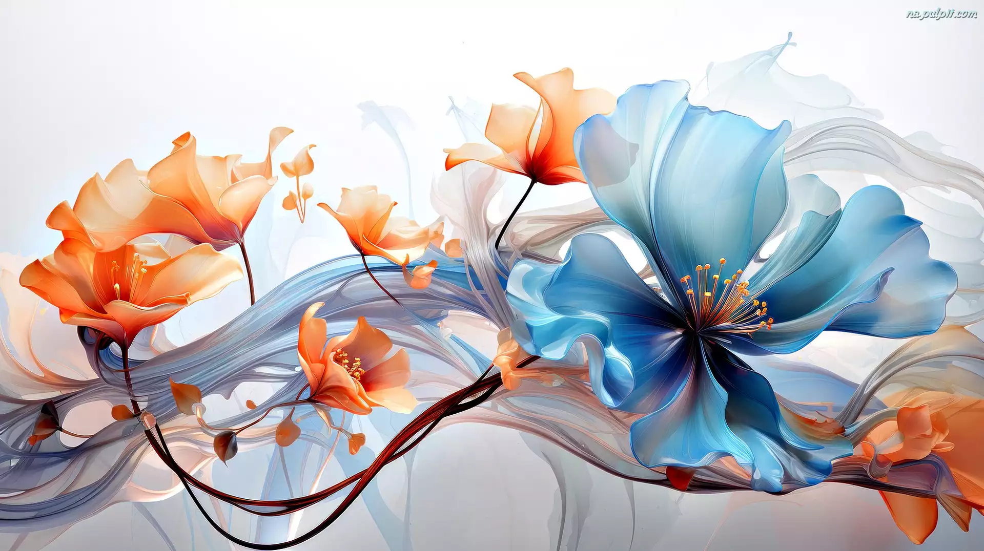 Kwiaty, Pomarańczowe, Niebieski, Grafika