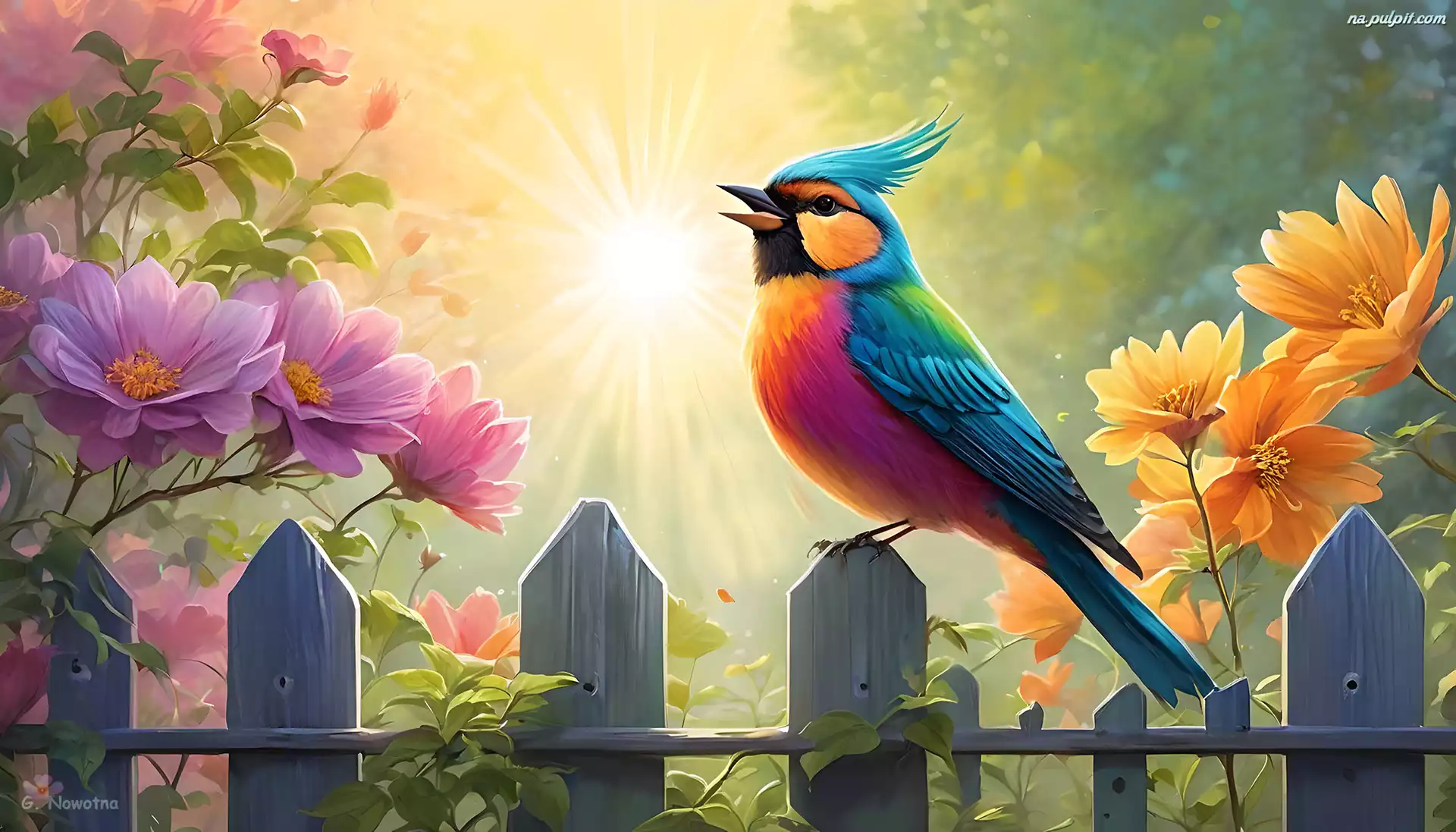 Płot, Kolorowy, Ptak, Grafika AI, Kwiaty Na Pulpit