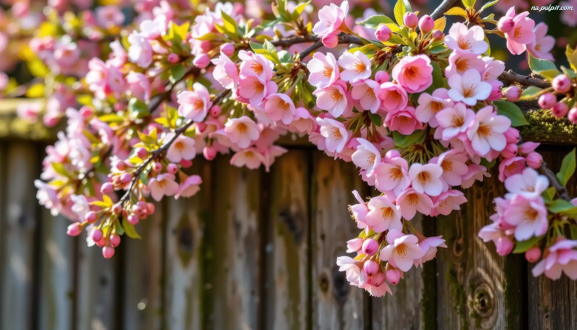 Grafika AI, Drewniany, Drzewo owocowe, Różowe, Kwiaty, Gałązki, Płot Na Pulpit