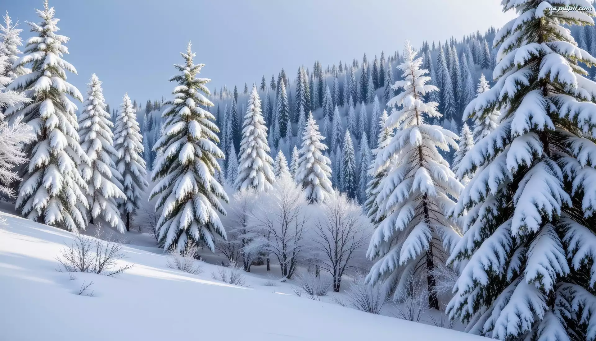 Drzewa, Zima, Zbocze, Grafika AI, Las Na Pulpit