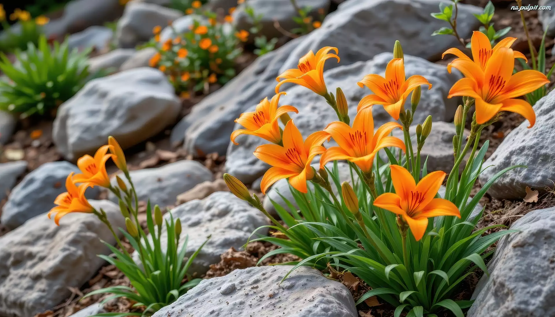 Kamienie, Kwiaty, Pomarańczowe, Grafika AI, Lilie Na Pulpit