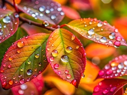 Krople, Mokre, Kolorowe, Grafika AI, Liście
