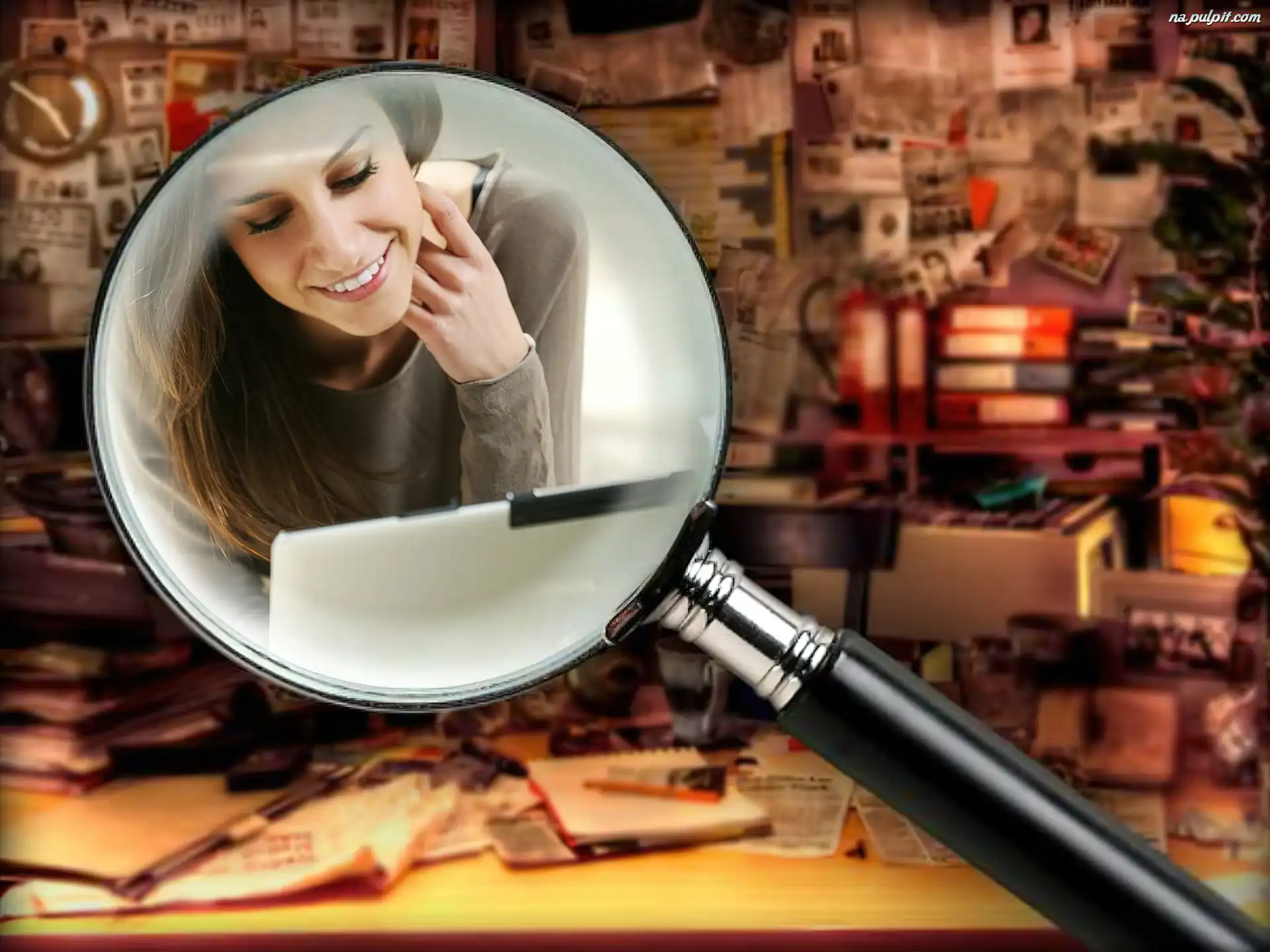 Grafika, Kobieta, Lupa, Laptop Na Pulpit