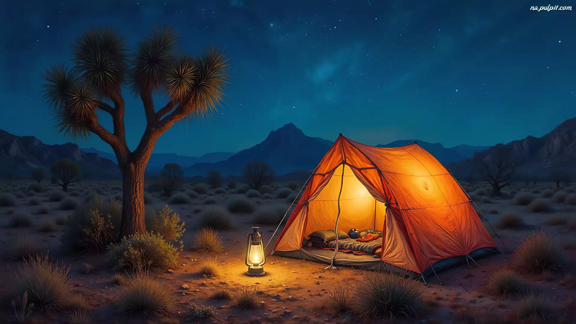 Grafika AI, Lampa naftowa, Namiot, Góry, Noc, Gwiazdy, Drzewo Na Pulpit