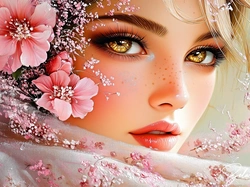 Kwiaty, Kobieta, Piwne, Grafika AI, Oczy