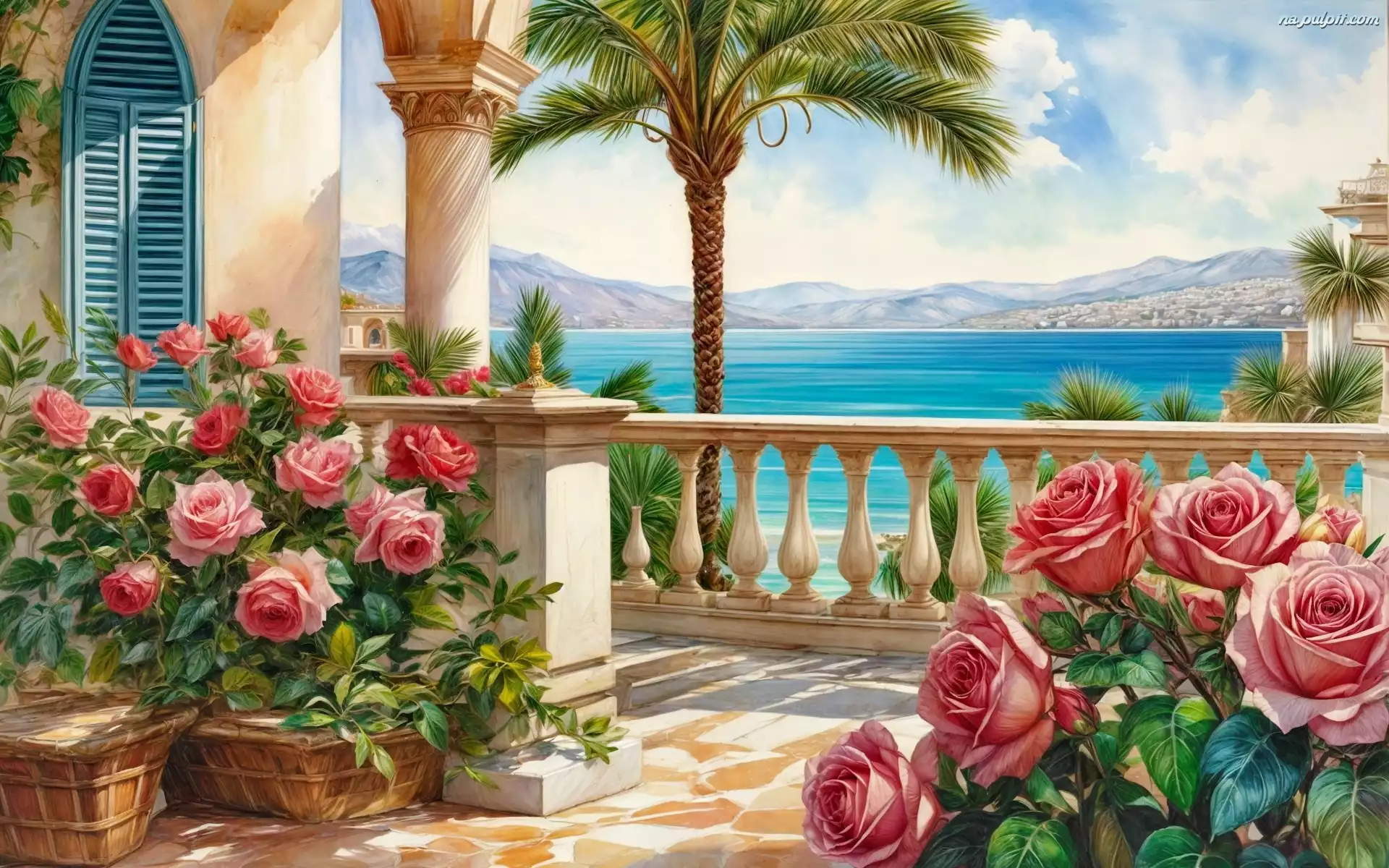 Dom, Kwiaty, Palma, Grafika, Morze, Balkon, Róże Na Pulpit