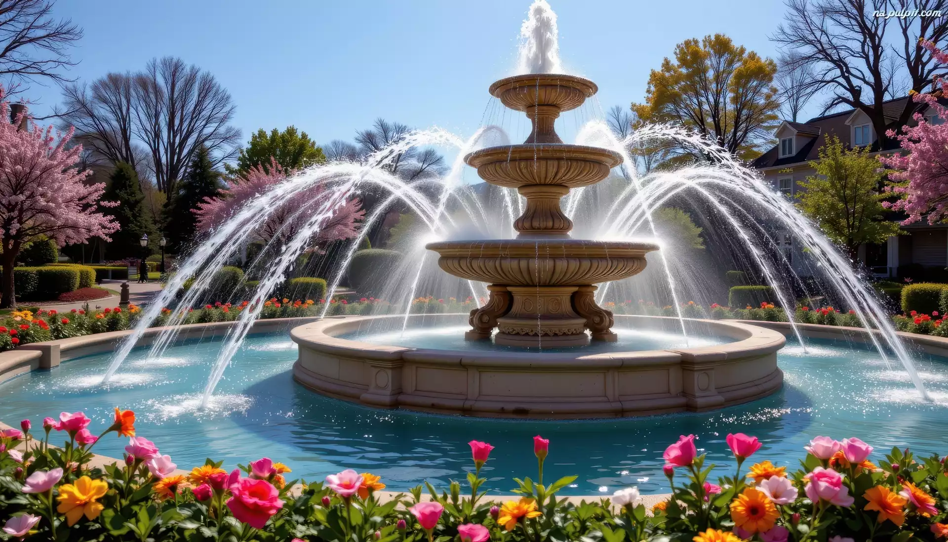 Wiosna, Fontanna, Kwiaty, Grafika AI, Park Na Pulpit