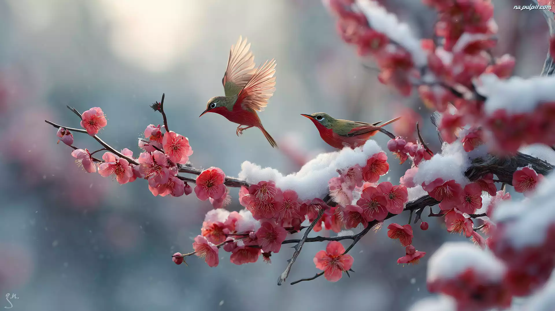 Grafika AI, Gałązka, Kwiaty, Zielono-czerwone, Ptaki, Czerwone, Śnieg Na Pulpit