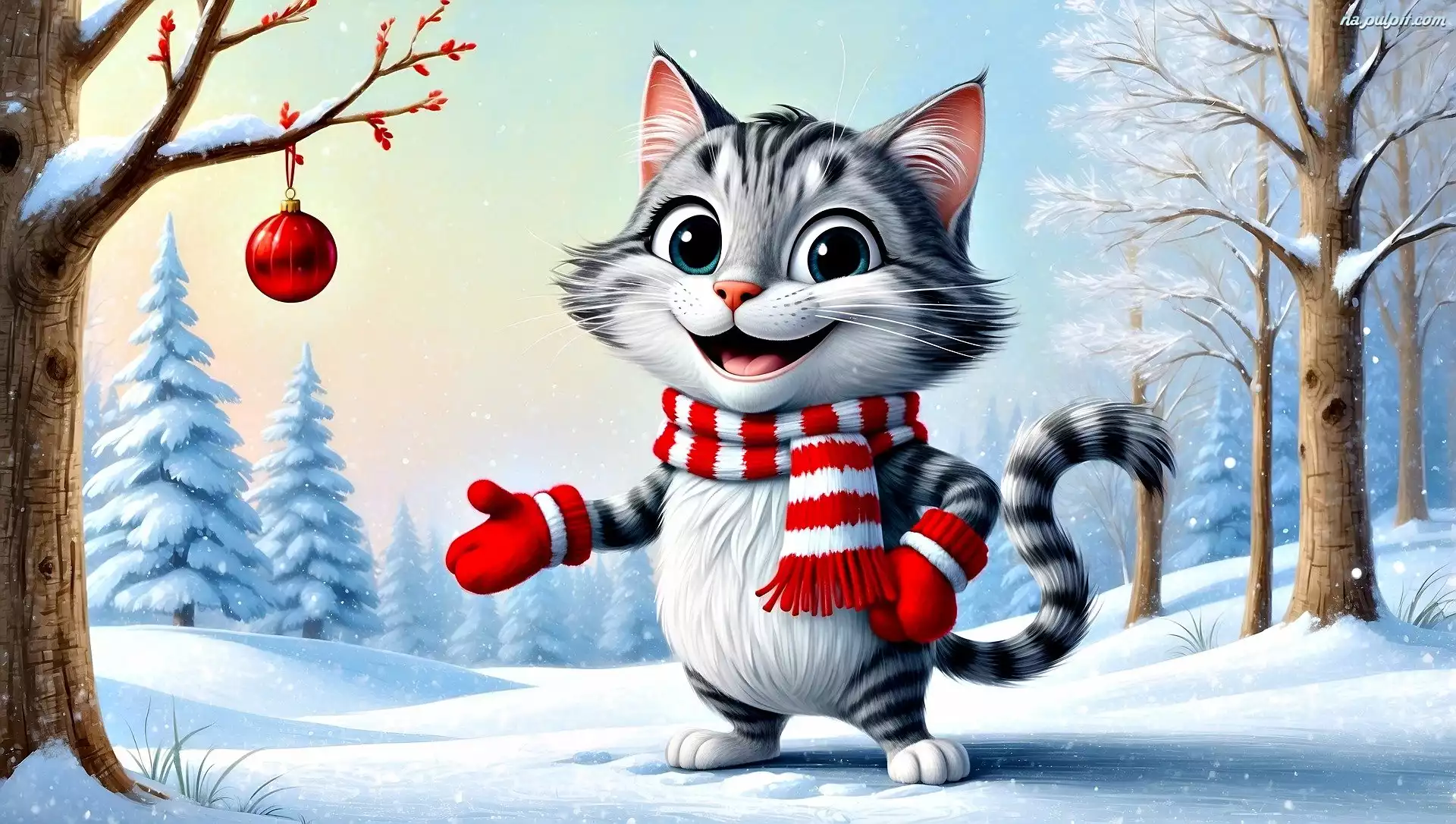 Bombka, Zima, Rękawice, Grafika, Kot, Szalik, Drzewa Na Pulpit