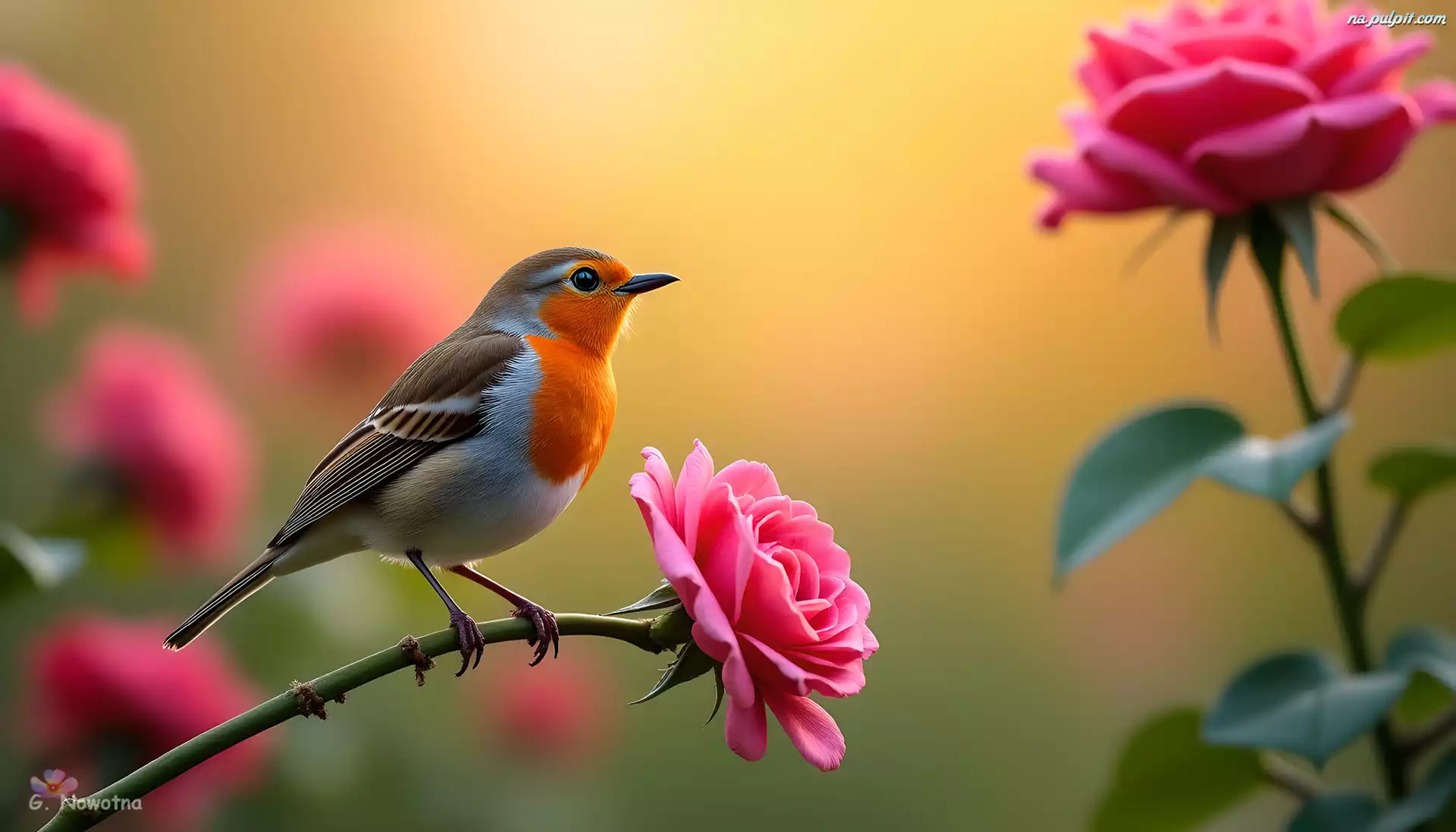 Kwiat, Rudzik, Ptak, Grafika AI, Róża Na Pulpit