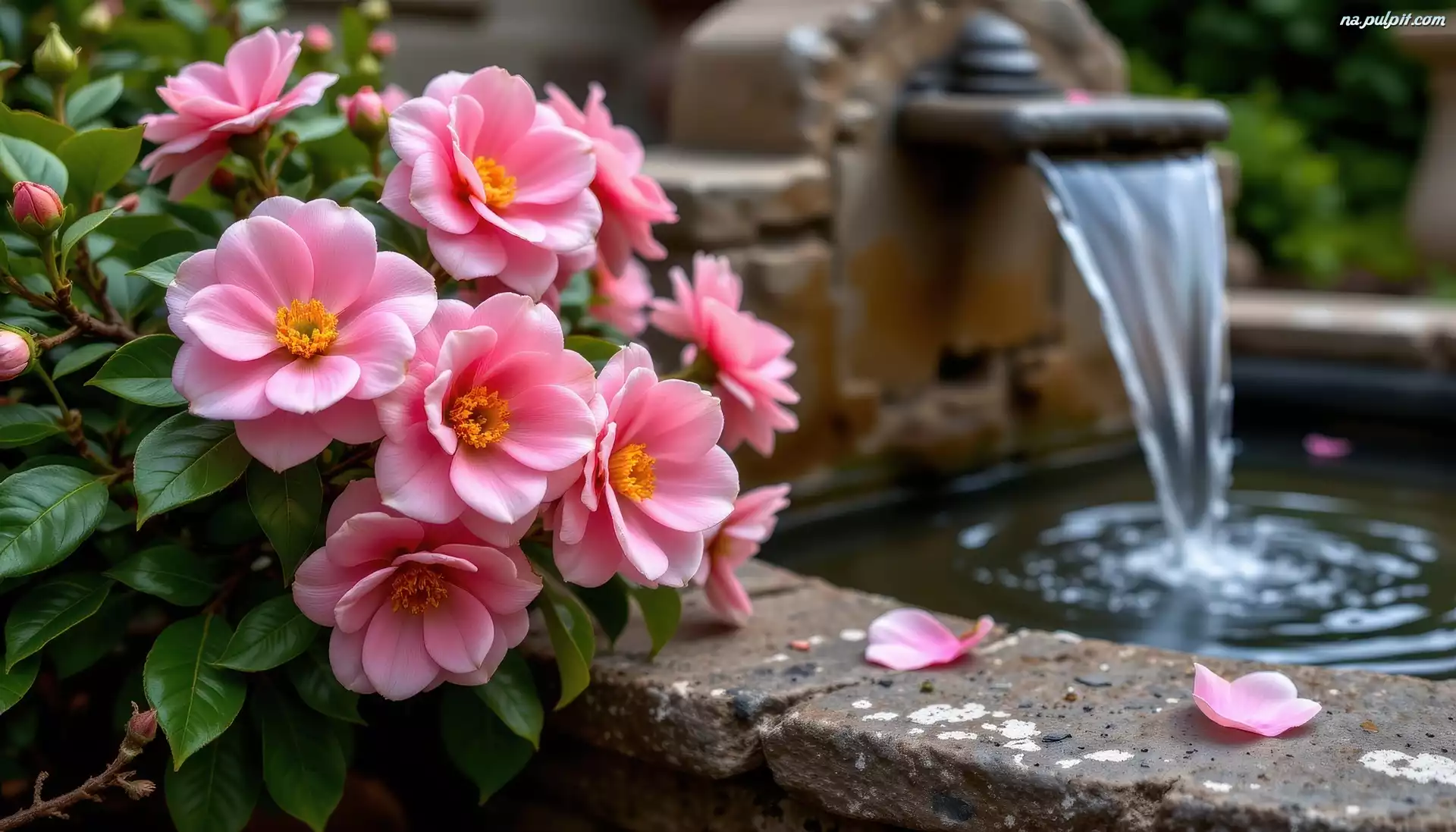 Różowe, Kwiaty, Fontanna, Grafika Na Pulpit