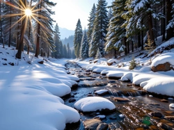 Grafika AI, Las, Drzewa, Zima, Potok, Rzeka, Promienie słońca