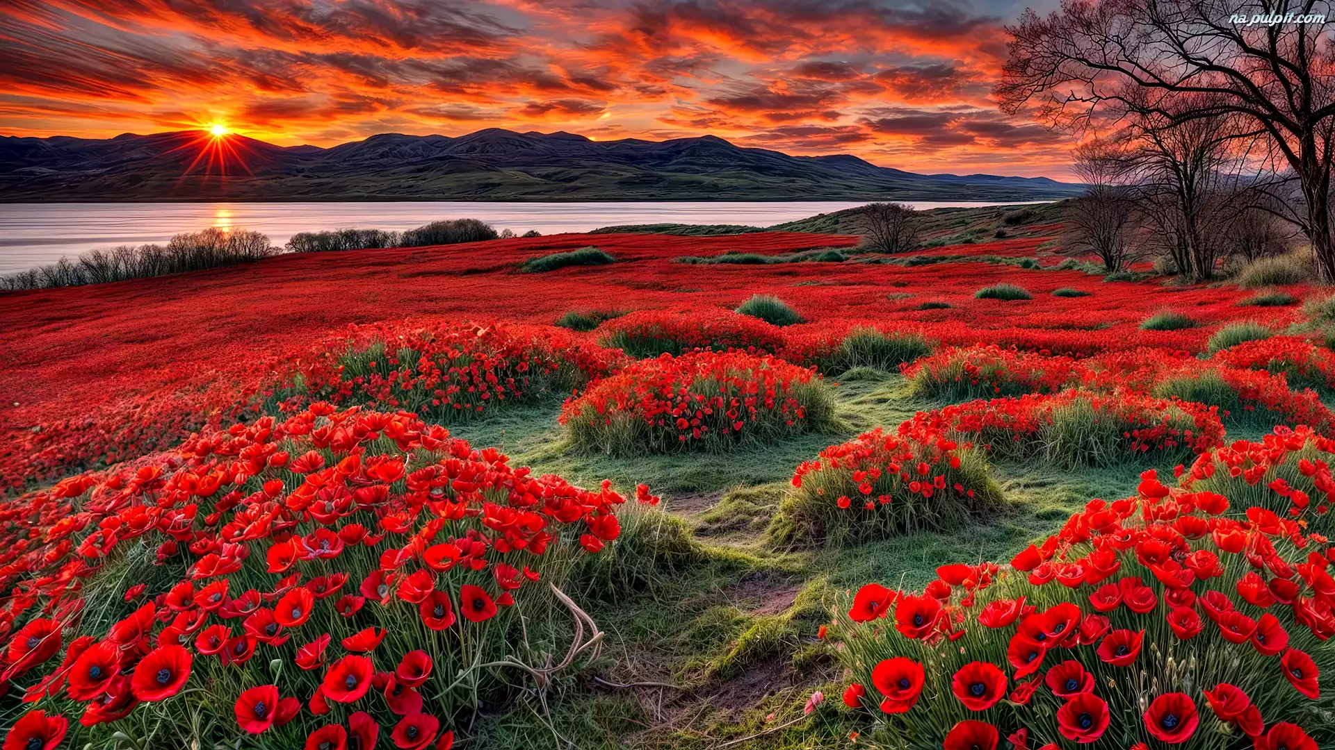 Łąka, Zachód słońca, Góry, Maki, Czerwone, Kwiaty, Grafika Na Pulpit