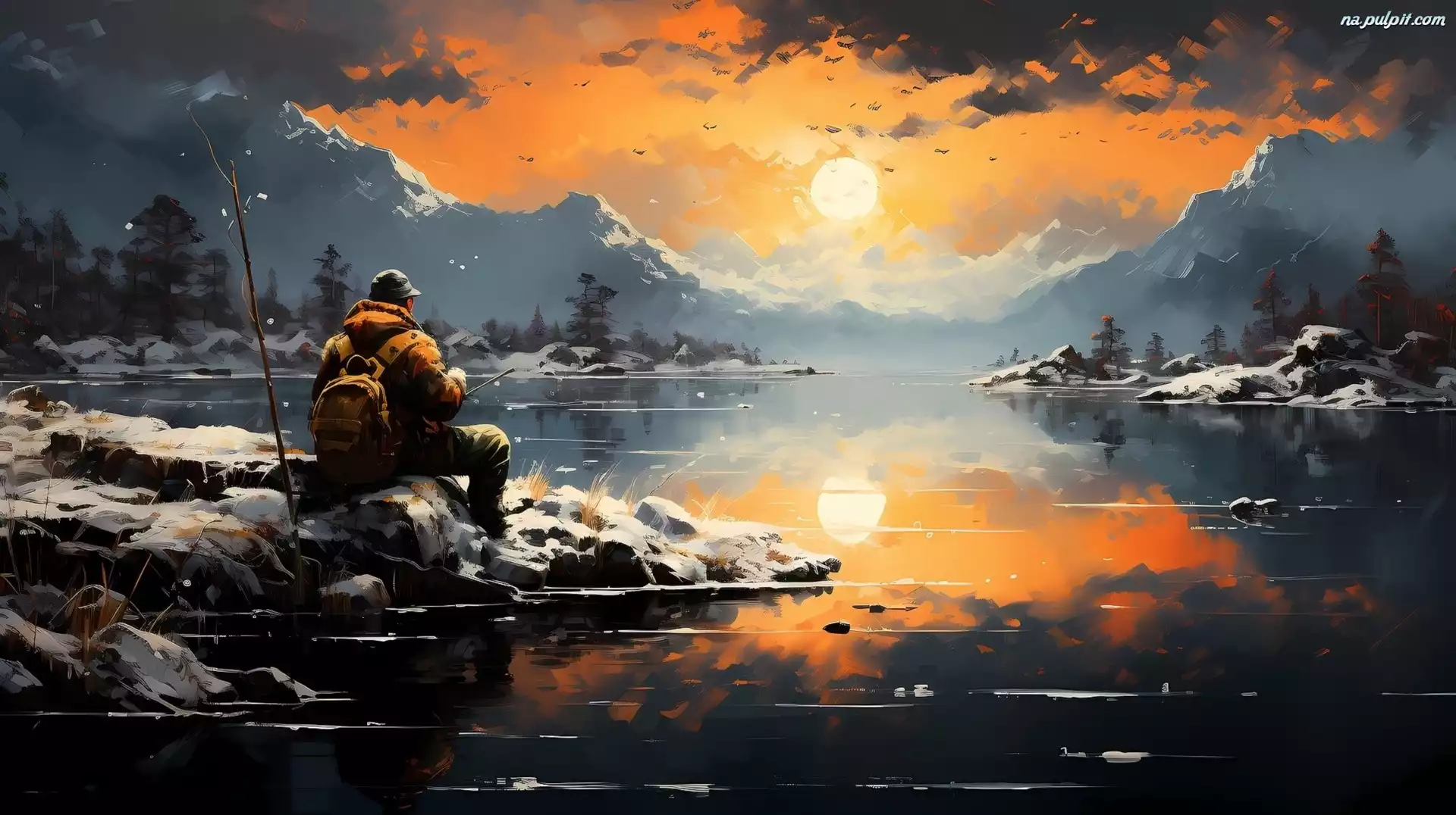 2D, Zachód słońca, Mężczyzna, Zima, Jezioro, Góry, Grafika Na Pulpit