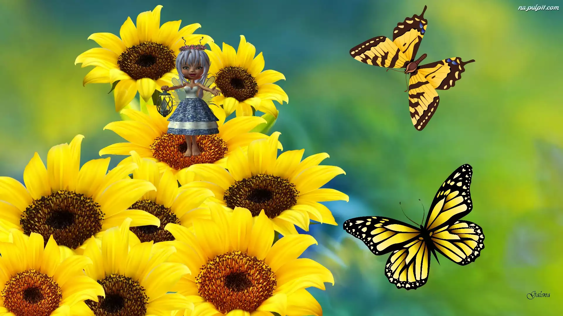 Grafika, Laleczka, Słoneczniki, Motyle Na Pulpit