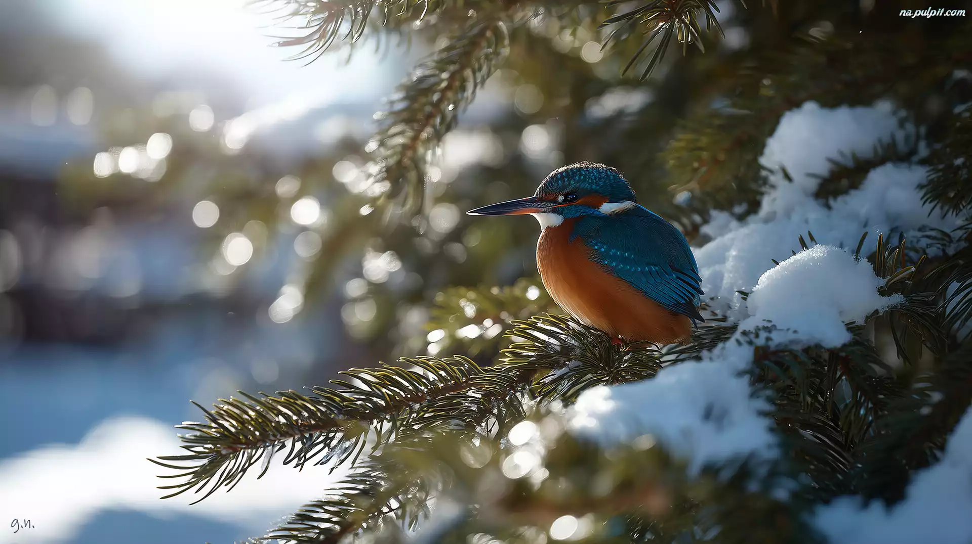 Zima, Zimorodek, Świerk, Grafika AI, Śnieg Na Pulpit
