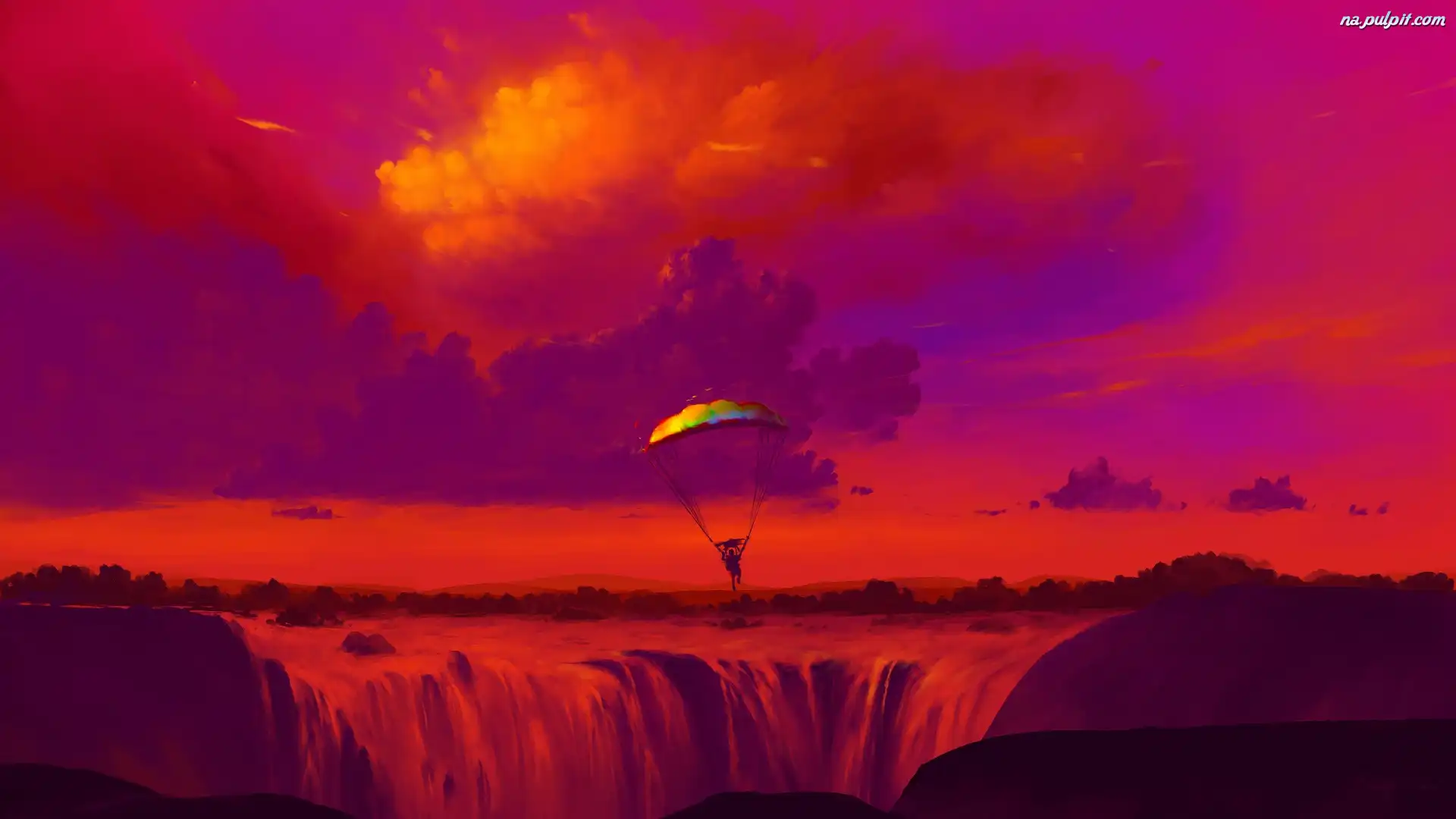 Grafika, Czerwone, Wodospad, Spadochroniarz, Niebo Na Pulpit