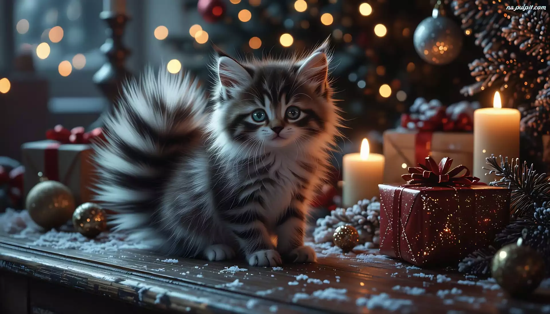 Choinka, Kot, Prezent, Grafika AI, Świece Na Pulpit
