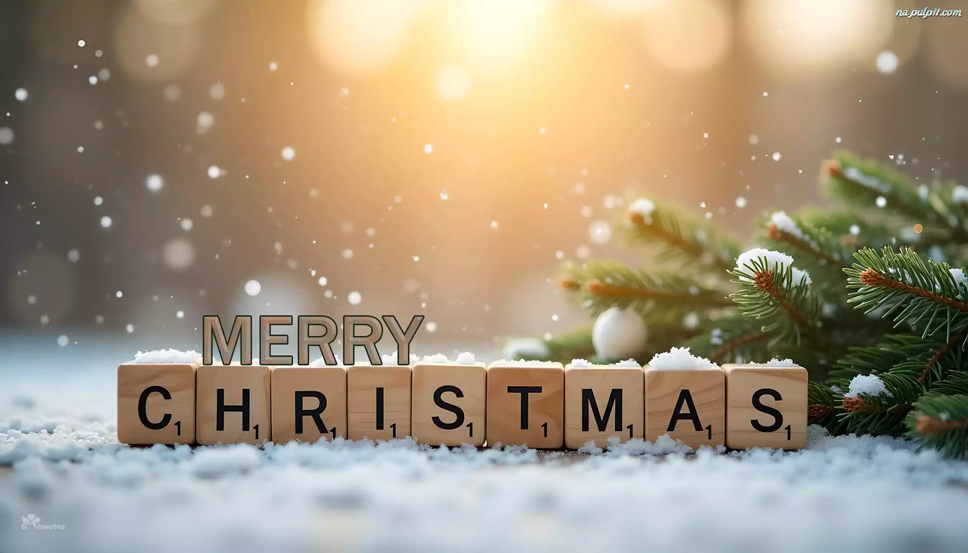 Boże Narodzenie, Świerkowe, Gałązki, Drewniane, Klocki, Śnieg, Grafika Na Pulpit