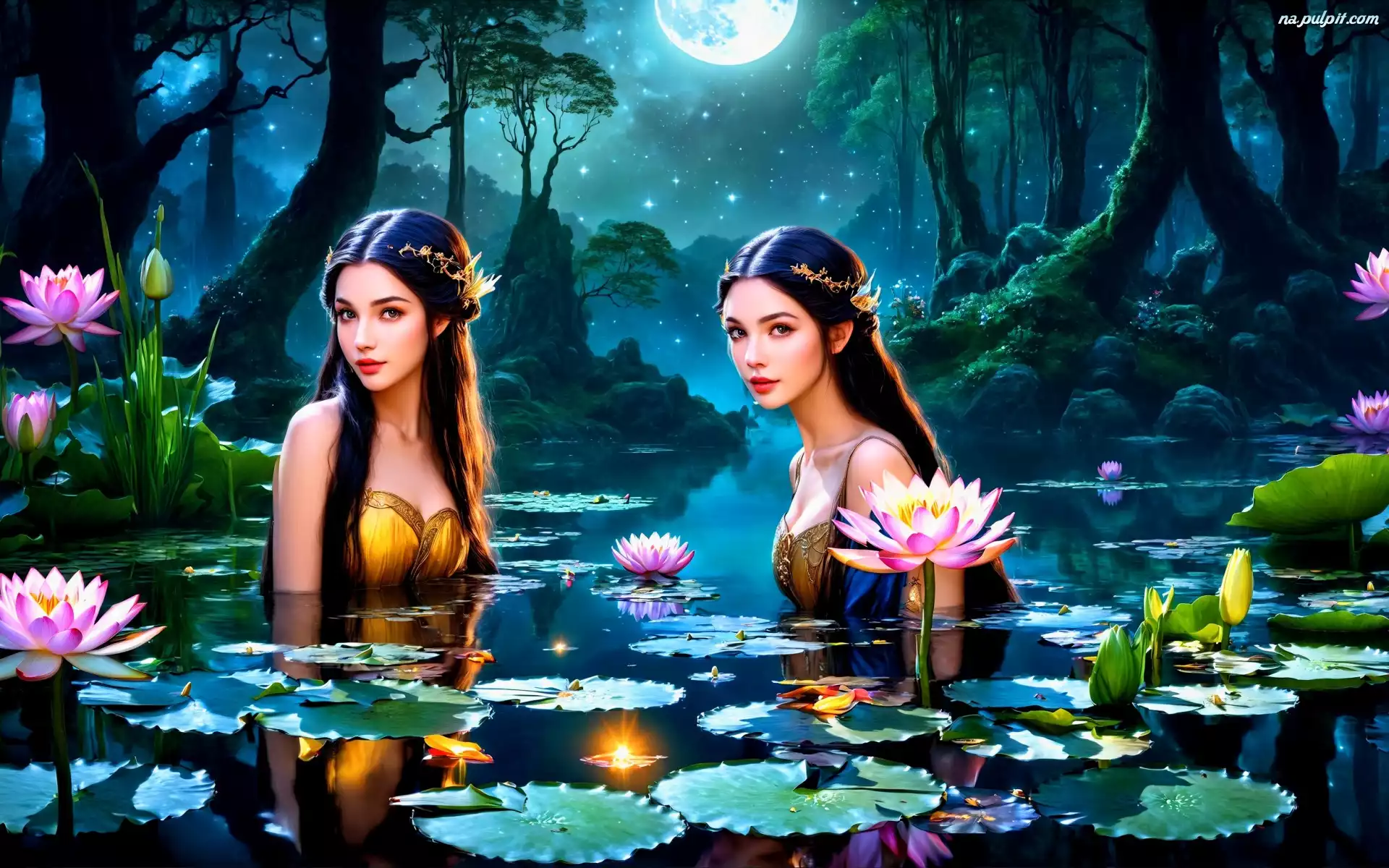 Księżyc, Dziewczyny, Staw, Grafika, Lilie wodne Na Pulpit