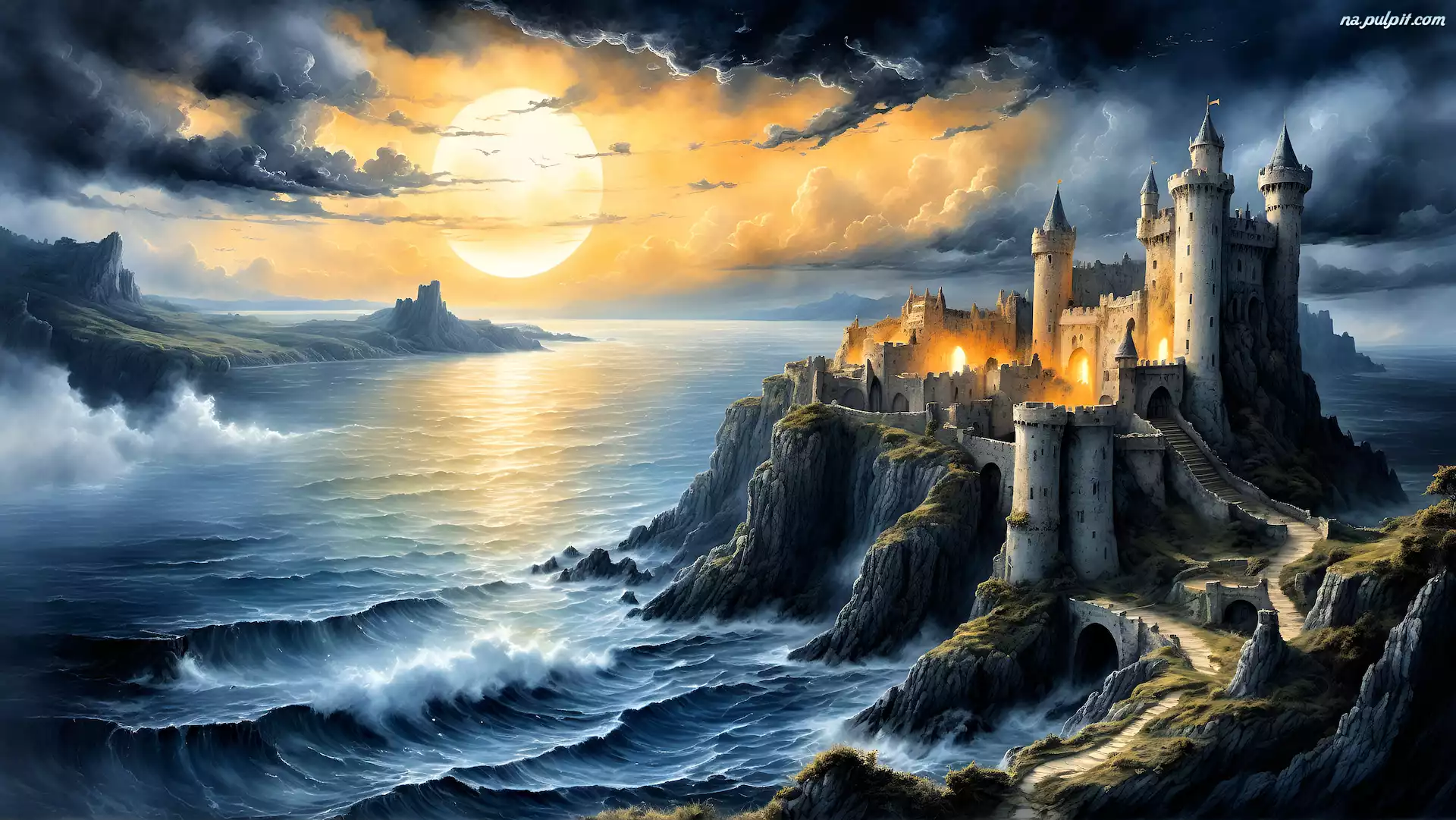Fantasy, Słońce, Zamek, Grafika, Morze, Skały, Chmury Na Pulpit