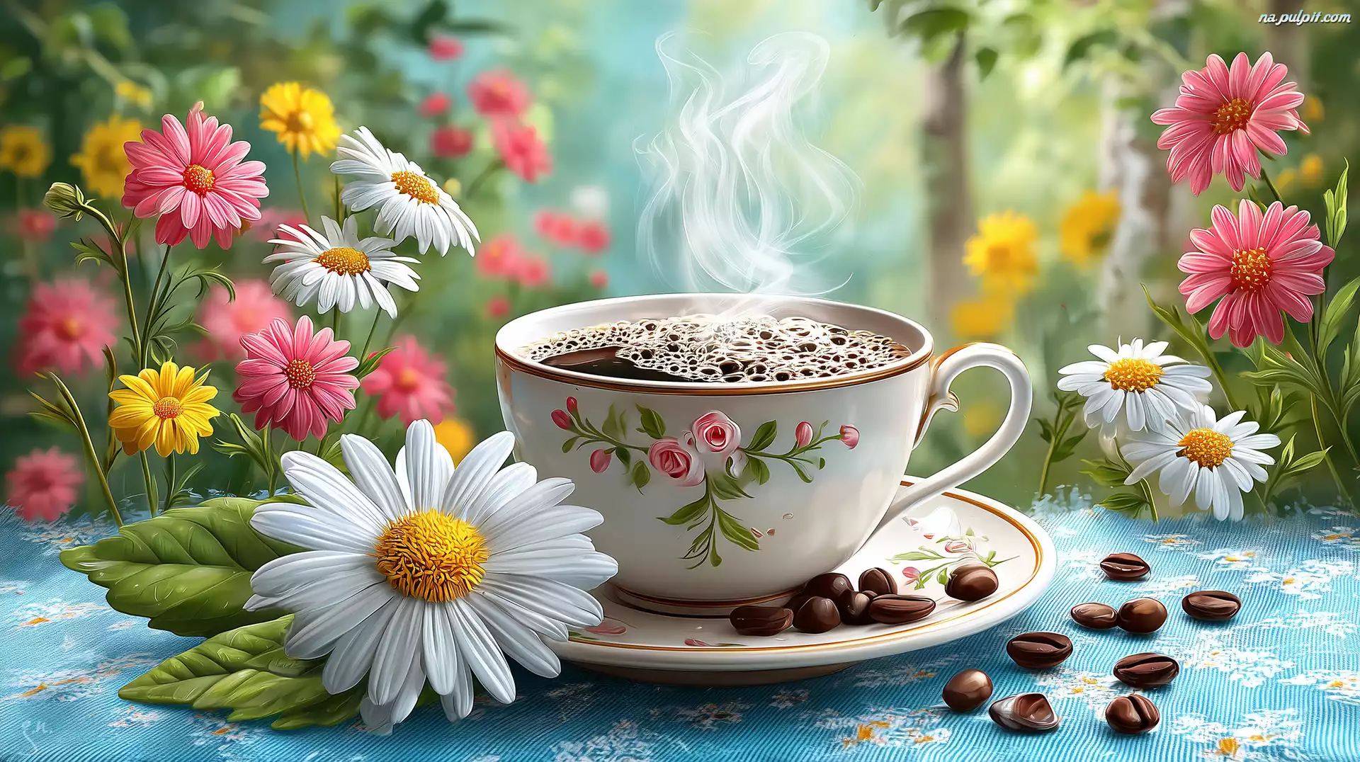 Kwiaty, Filiżanka, Kawa, Grafika AI, Ziarna Na Pulpit