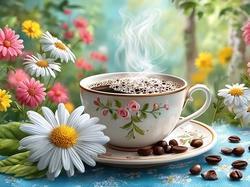 Kwiaty, Filiżanka, Kawa, Grafika AI, Ziarna
