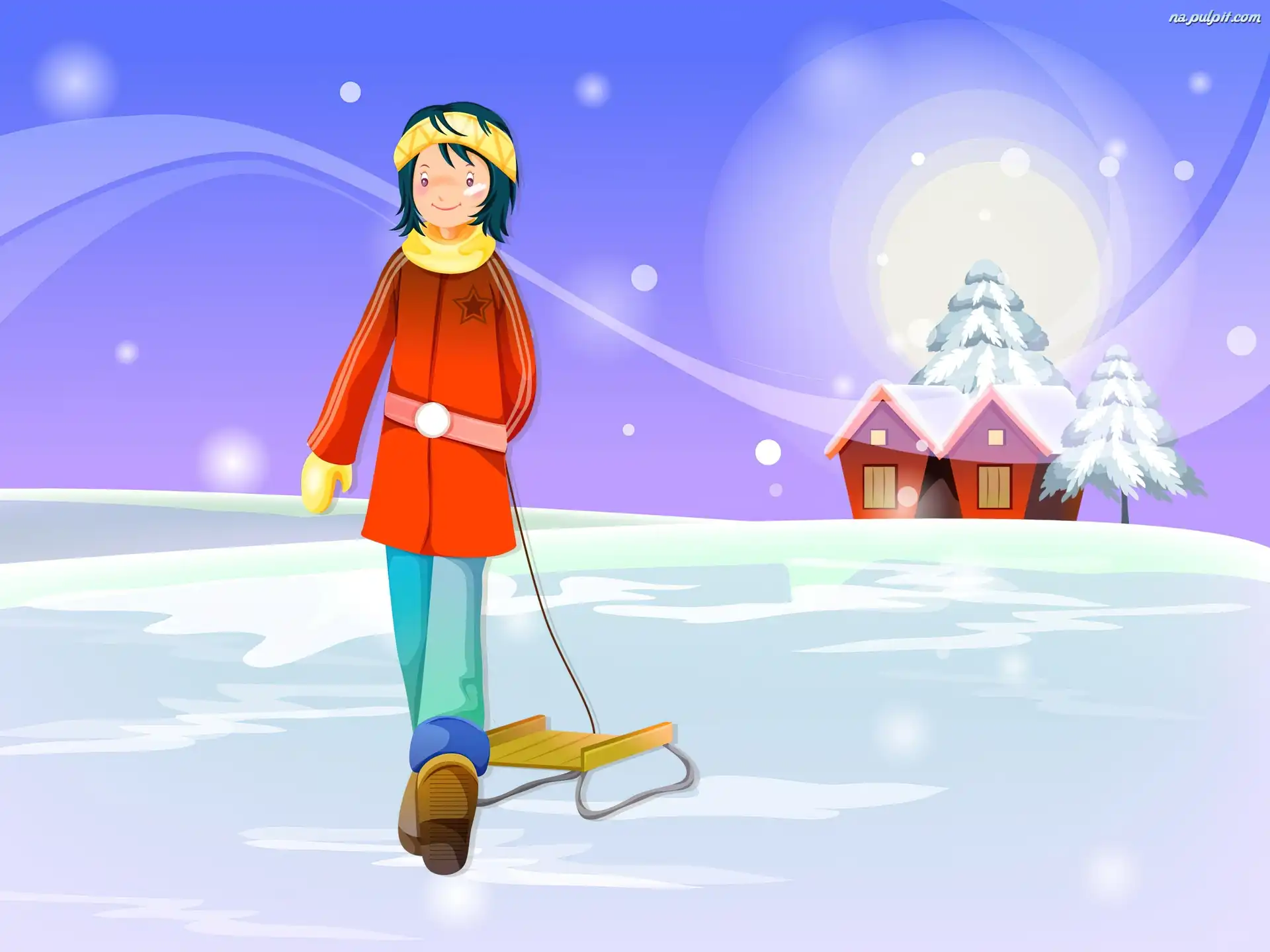Grafika, Dziewczyna, Śnieg, Zima, Sanki Na Pulpit