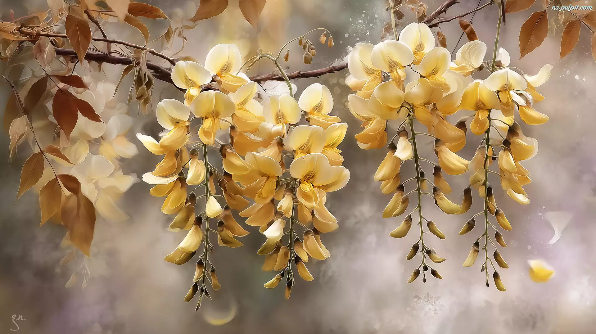 Kwiaty, Gałązka, Złotokap, Grafika AI, Żółte Na Pulpit