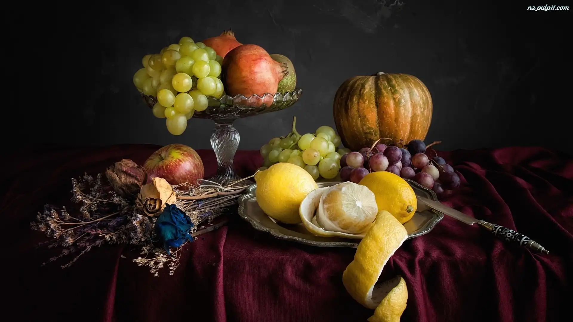 Suszone, Owoce, Cytryny, Winogrona, Kwiaty, Patera, Dynia, Kompozycja, Granaty Na Pulpit