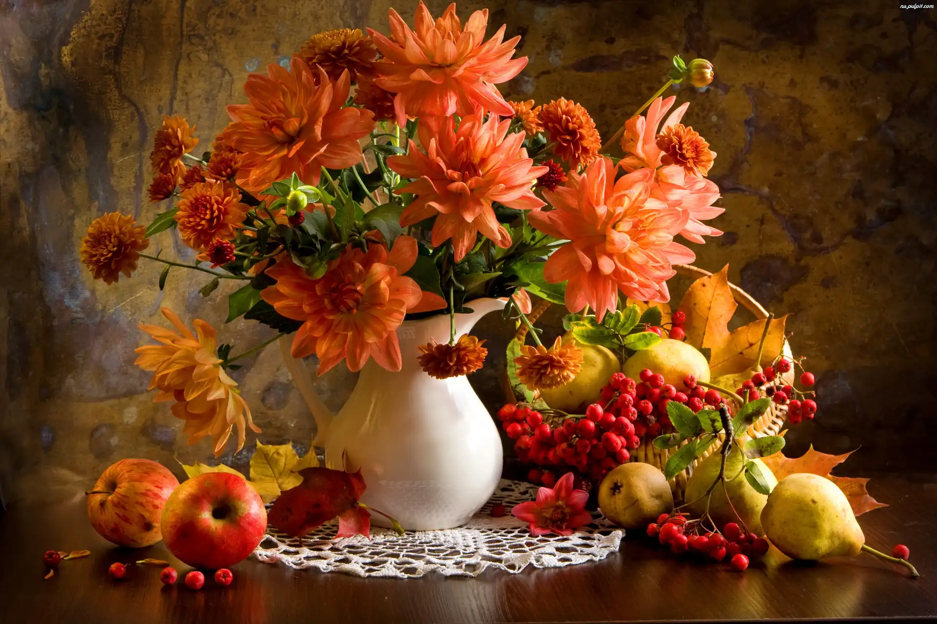 Gruszki, Serweta, Kwiaty, Wazon, Jabłka Na Pulpit